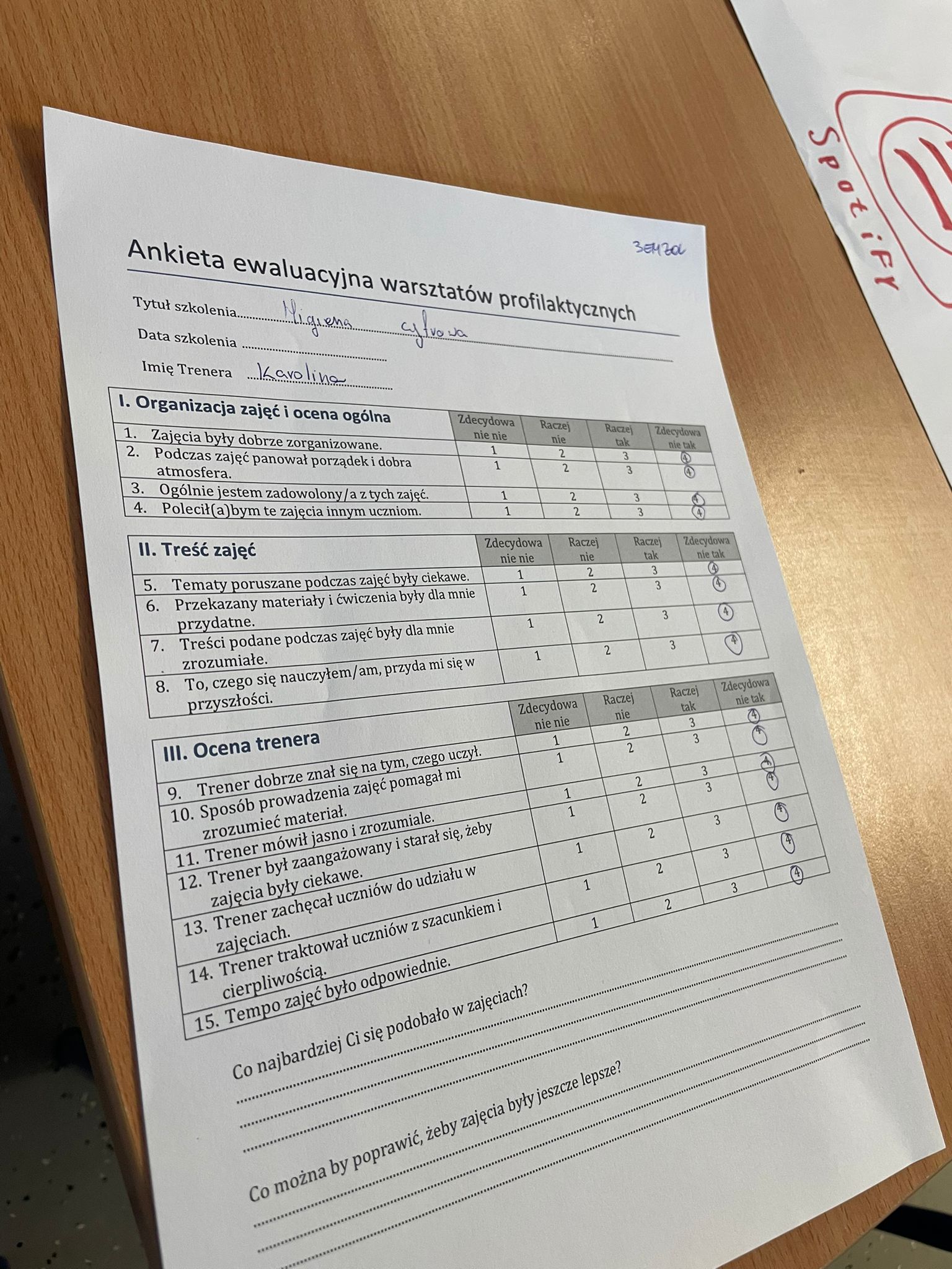 Podczas tych warsztatów nasi uczniowie zajmowali się tematami dotyczącymi: zarządzania czasem spędzanym przed ekranem, ochroną danych oraz bezpieczeństwa w sieci. Kluczowe zagadnienia obejmowały m.in. świadome korzystanie z urządzeń, wyłączanie powiadomień, tworzenie kopii zapasowych, stosowanie silnych haseł, dbanie o odpoczynek od technologii i rozwijanie pasji offline. Warsztaty prowadziły Panie Trenerki z Fundacji „Dbam o mój zasięg”.