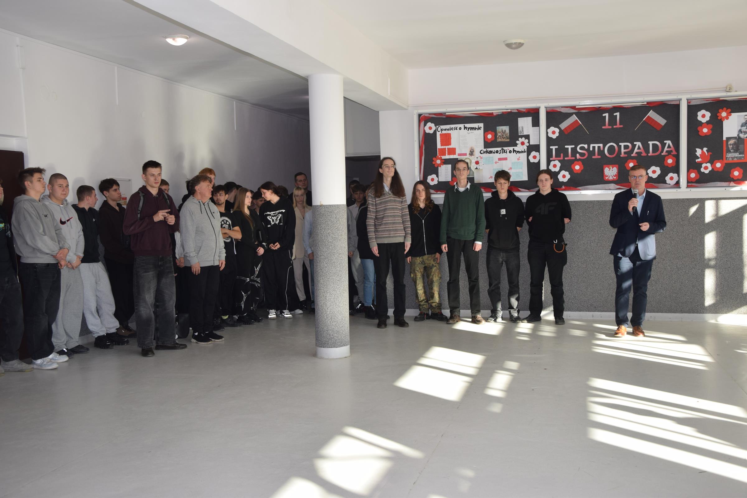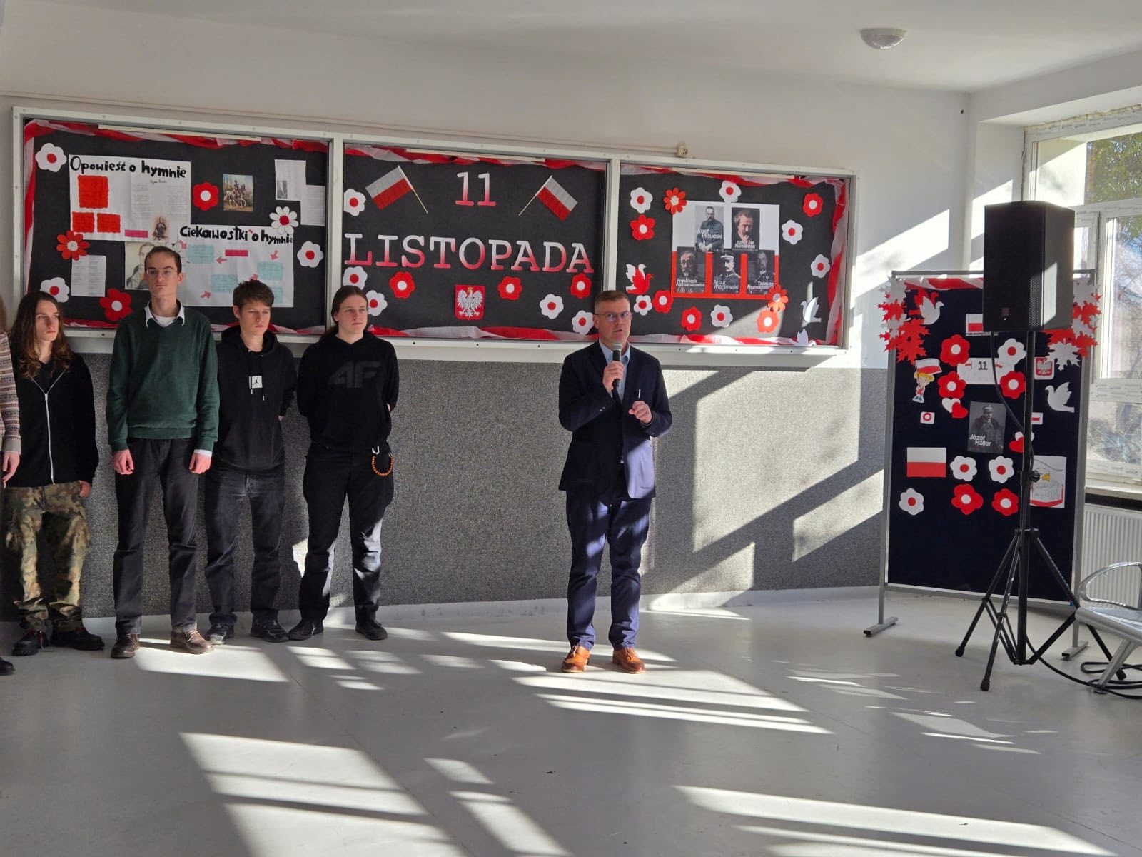 Przed wspólnym śpiewem, Pan Wicedyrektor Dariusz Grzybek przypomniał najważniejsze wydarzenia związane z odzyskaniem przez Polskę niepodległości w 1918 roku.